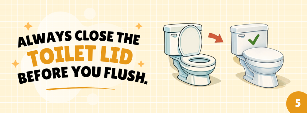 It's often the smallest changes that make the biggest impact, and we’re all here for it. Always closing the toilet lid before you flush is a simple but powerful household habit to adopt from here on out. Because here’s the gross truth: the rushing water from every flush sends tiny droplets shooting up and out into the air. And yes, those droplets are made up of whatever was in the toilet bowl when you flushed. These aerosols can carry bacteria and viruses that can hang around and land on nearby surfaces. Shutting the lid, along with regular cleaning and proper handwashing, can be your best bet to keep the bathroom clean.